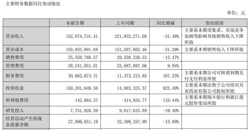 亚太药业在半年报中解释称,公司营业收入同比下降31.48%,主要系本期受集采、市场竞争加剧等影响导致销售收入下降所致;公司净利润较上年同期增长1,820.97%,主要系公司本期出售全资子公司绍兴兴亚药业有限公司100%股权,相应增加公司2025年半年度利润总额约1.49亿元所致,剔除上述非经常性损益项目等的影响,公司本期扣除非经常性损益后的净利润较上年同期下降524.31%。