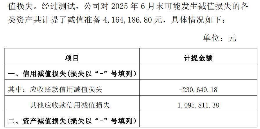 8月29日晚间,亚太药业还发布了关于计提信用减值损失、资产减值损失的公告。经过测试,公司对2025年6月末可能发生减值损失的各类资产共计提了减值准备416.42万元,相应减少公司2025年半年度利润总额416.42万元。